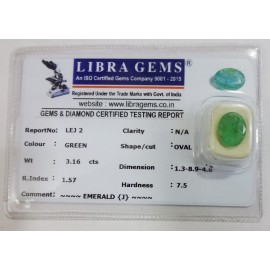 REPORT NO . LEJ 2CLARITY . N/ACOLOUR . GREENSHAPE / CUT . OVALWT . 3.16 CTSDIMENSION . 1-3.8-9.4-8.R . INDEX . 1.57HARDNESS . 7.5COMMENT . EMERALD ( J )..
