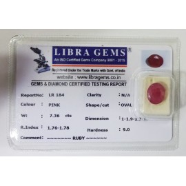 REPORT NO . LR 184CLARITY . N/ACOLOUR . PINKSHAPE / CUT . OVALWT . 7.36 CTSDIMENSION . 1-1.9-2.7-1.R . INDEX . 1.76-1.78HARDNESS . 9.0COMMENT . RUBY..