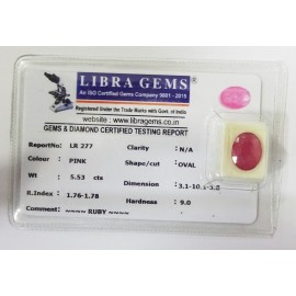 REPORT.NO.-LR 277CLARITY.-N/ACOLOUR.-PINKSHAPE/CUT.-OVALWT.-5.53 CTSDIMENSION.-3.1-10.1-3.8R.INDEX.-1.76-1.78HARDNESS.-9.0COMMENT.-RUBY..