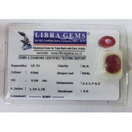 REPORT NO . LR 33CLARITY . N/ACOLOUR . PINKSHAPE / CUT . OVALWT . 9.06 CTSDIMENSION . 3-2.1-7.6-3.R . INDEX . 1.76-1.78HARDNESS . 9..0COMMENT . RUBY..
