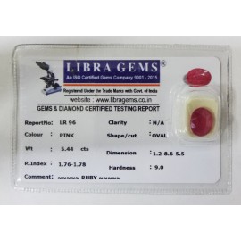 REPORT NO . LR 96CLARITY . N/ACOLOUR . PINKSHAPE / CUT . OVALWT . 5.44 CTSDIMENSION . 1-2.8-6.5-5.R . INDEX . 1.76-1.78HARDNESS . 9.0COMMENT . RUBY..