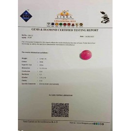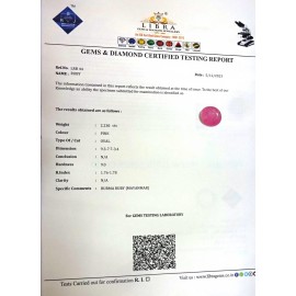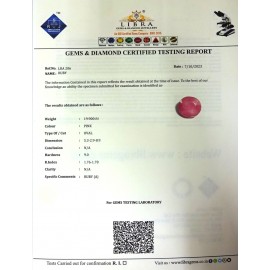 DATE:18-8-2023REF.NO:LRB 23NAME:RUBYWEIGHT:5.76 CTSCOLOUR:PINKTYPE OF/CUT:OVALDIMENSION:1-1.9-5.6-4.CONCLUSION:N/AHARDNESS:9.0R.INDEX:1.76-1.78CLARITY:N/ASPECIFIC COMMENTS:BURMA RUBY { MAYAN..