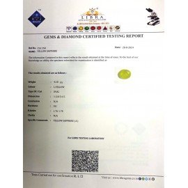 REPORT NO . LY-63CLARITY . N/ACOLOUR . YELLOWSHAPE / CUT . OVALWT . 5.56 CTSDIMENSION . 1-3.8-7.5-7.R . INDEX . 1.76-1.78HARDNESS . 9.0COMMENT . YELLOW SAPPHIRE..