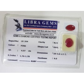 REPORT NO . LR 204CLARITY . N/ACOLOUR . PINKSHAPE / CUT . OVALWT . 4.07 CTSDIMENSION . 10-1.8-2.5-1.R . INDEX . 1.76-1.78HARDNESS . 9.0COMMENT . RUBY..