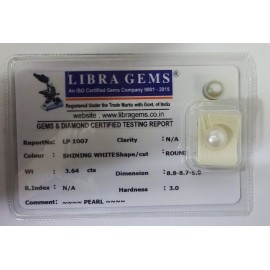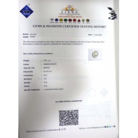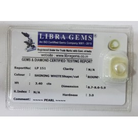 REPORT NO . LP 151CLARITY . N/ACOLOUR . SHINING WHITESHAPE / CUT . ROUNDWT . 3.40 CTSDIMENSION . 8-7.8-6.5-9.R . INDEX . N/AHARDNESS . 3.0COMMENT . PEARL..