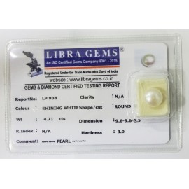 REPORT.NO-LP 938CLARITY-N/ACOLOUR-SHINING WHITESHAPE/CUT-ROUNDWT-4.71 CTSDIMENSION-9.6-9.6-6.5R.INDEX-N/AHARDNESS-3.0COMMENT-PEARL..