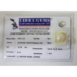 REPORT NO . LPS 113CLARITY . N/ACOLOUR . SHINING WHITESHAPE / CUT . ROUNDWT . 9.70 CTSDIMENSION . 10-9.10-8.10-9.R . INDEX . N/AHARDNESS . 3.0COMMENT . C / WATER PEARL { SOSI }..