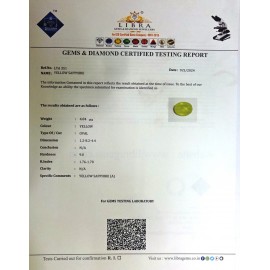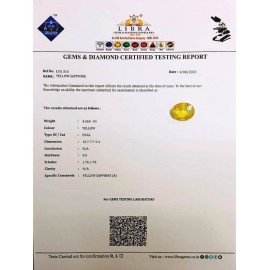 REPORT.NO.LYA 174CLARITY.N/ACOLOUR.YELLOWSHAPE/CUT.OVALWT.3.44 CTSDIMENSION.9.7-8.2-4.1R.INDEX.1.76-1.78HARDNESS.9.0COMMENT.YELLOW SAPPHIRE {A}..