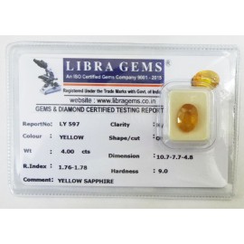 REPORT.NO.LY 597CLARITY.N/ACOLOUR.YELLOWSHAPE/CUT.OVAL WT.4.00 CTSDIMENSION.10.7-7.7-4.8R.INDEX.1.76-1.7.8HARDNESS.9.0COMMENT.YELLOW SAPPHIRE..