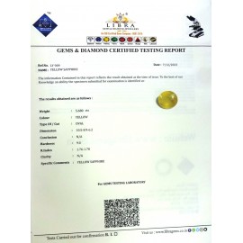 REPORT.NO.-LY 475CLARITY.-N/ACOLOUR.-YELLOWSHAPE/CUT.-OVALWT.-5.93 CTSDIMENSION.-10-4.9-4.6-8.R.INDEX.-1.76-1.78HARDNESS.-9.0COMMENT.-YELLOW SAPPHIRE..