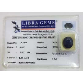 REPORT.NO.-LN 250CLARITY.-N/ACOLOUR.-BLUESHAPE/CUT.-OVALWT.-7.63 CTSDIMENSION.-2-2.10-7.6-1.R.INDEX.-1.76-1.78HARDNESS.-9.0COMMENT.-BLUE SAPPHIRE..