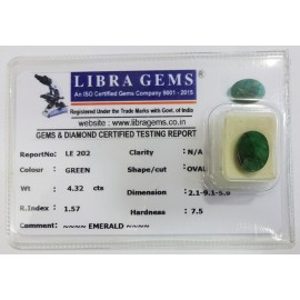 REPORT.NO.-LE 202CLARITY.-N/ACOLOUR.-GREENSHAPE/CUT.-OVALWT.-4.32 CTSDIMENSION.-2.1-9.1-5.9R.INDEX.-1.57HARDNESS.-7.5COMMENT.-EMERALD..