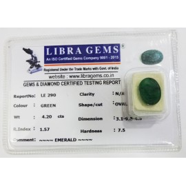 REPORT.NO.-LE 290CLARITY.-N/ACOLOUR.-GREENSHAPE/CUT.-OVALWT.-4.20 CTSDIMENSION.-3-1.9-8.4-5.R.INDEX.-1.57HARDNESS.-7.5COMMENT.-EMERALD..
