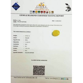 REPORT NO . LY 289CLARITY . N/ACOLOUR . YELLOWSHAPE / CUT . OVALWT . 3.29 CTSDIMENSION . 9-5.7-1.5-1.R . INDEX . 1.76-1.78HARDNESS . 9.0COMMENT . YELLOW SAPPHIRE..