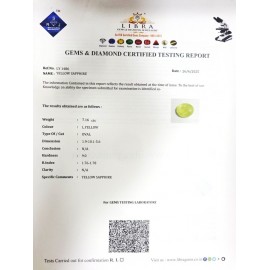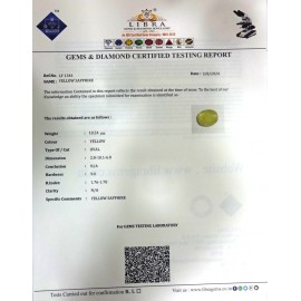 REPORT.NO.-LY 718CLARITY.-N/ACOLOUR.-YELLOWSHAPE/CUT.-OVALWT.-6.20 CTSDIMENSION.-2-1.8-3.6-4.R.INDEX.-1.76-1.78HARDNESS.-9.0COMMENT.-YELLOW SAPPHIRE..