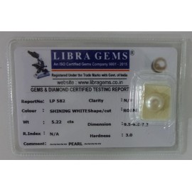 REPORT NO . LP 582CLARITY . N/ACOLOUR . SHINING WHITESHAPE / CUT . ROUNDWT . 5.22 CTSDIMENSION . 9-5.9-3.7-2.R . INDEX . N/AHARDNESS . 3.0COMMENT . PEARL..