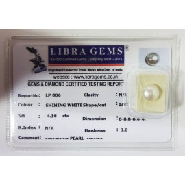 REPORT NO . LP 806CLARITY . N/ACOLOUR . SHINING WHITE SHAPE / CUT . ROUNDWT . 4.10 CTSDIMENSION . 8-8.8-8.6-6.R . INDEX . N/AHARDNESS . 3.0COMMENT . PEARL..