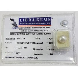 REPORT.NO.-LPKC 48CLARITY.-N/ACOLOUR.-SHINING WHITESHAPE/CUT.-ROUNDWT.-4.72 CTSDIMENSION.-9-2.9-1.7-8.R.INDEX.-N/AHARDNESS.-3.0COMMENT.-PEARL K.C { HONGKOK }..