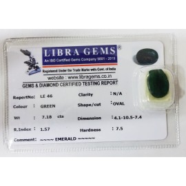 REPORT NO . LE 46CLARITY . N/ACOLOUR . GREENSHAPE / CUT . OVALWT . 7.18 CTSDIMENSION . 4-1.10-5.7-4.R . INDEX . 1.57HARDNESS . 7.5COMMENT . EMERALD ..