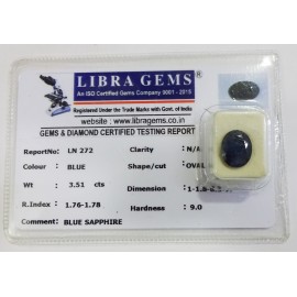 REPORT.NO.-LN 272CLARITY.-N/ACOLOUR.-BLUESHAPE/CUT.-OVALWT.-3.51 CTSDIMENSION.-1-1.8-8.3-7.R.INDEX.-1.76-1.78HARDNESS.-9.0COMMENT.-BLUE SAPPHIRE..