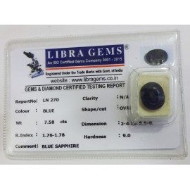 REPORT.NO.-LN 270CLARITY.-N/ACOLOUR.-BLUESHAPE/CUT.-OVALWT.-7.58 CTSDIMENSION.-2-4.10-6.5-6.R.INDEX.-1.76-1.78HARDNESS.-9.0COMMENT.-BLUE SAPPHIRE..