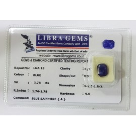 REPORT NO . LNA 13CLARITY . N/ACOLOUR . BLUESHAPE / CUT . RECTANGLEWT . 3.78 CTSDIMENSION . 9-2.7-1.5-2.R . INDEX . 1.76-1.78HARDNESS . 9.0COMMENT . BLUE SAPPHIRE { A }..