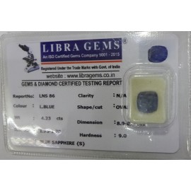 REPORT.NO.-LNS 86CLARITY.-N/ACOLOUR.-L. BLUESHAPE/CUT.-OVALWT.-4.23 CTSDIMENSION.-8-9.8-3.5-1.R.INDEX.-1.76-1.78HARDNESS.-9.0COMMENT.-BLUE SAPPHIRE { S }..