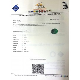 REPORT.NO.LEJ 244CLARITY.N/ACOLOUR.GREENSHAPE/CUT.OVALWT.2.96 CTSDIMENSION.10.2-8.2-5.1R.INDEX.1.57HARDNESS.7.5COMMENT.EMERALD {J}..