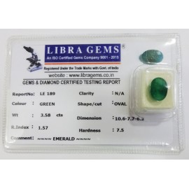 REPORT.NO.-LE 189CLARITY.-N/ACOLOUR.-GREENSHAPE/CUT.-OVALWT.-3.58 CTSDIMENSION.-10.6-7.7-6.2R.INDEX.-1.57HARDNESS.-7.5COMMENT.-EMERALD..