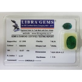 REPORT.NO.-LE 298CLARITY.-N/ACOLOUR.-GREENSHAPE/CUT.-OVALWT.-6.67 CTSDIMENSION.-4.8-10.9-5.9R.INDEX.-1.57HARDNESS.-7.5COMMENT.-EMERALD..