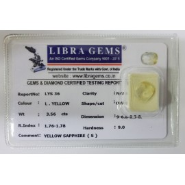 REPORT NO . LYS 36CLARITY . N/ACOLOUR . L . YELLOWSHAPE / CUT . OVALWT . 3.56 CTSDIMENSION . 9-6.8-8.3-8.R . INDEX . 1.76-1.78HARDNESS . 9.0COMMENT . YELLOW SAPPHIRE { S }..