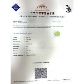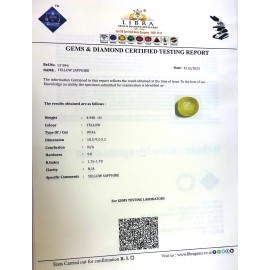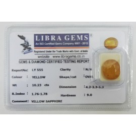 REPORT NO . LYA 34CLARITY . N/ACOLOUR . YELLOWSHAPE / CUT . OVALWT . 4.21 CTSDIMENSION . 10-1.8-7.5-5.R . INDEX . 1.76-1.78HARDNESS . 9.0COMMENT . YELLOW SAPPHIRE..