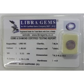REPORT.NO.-LNS 95CLARITY.-N/ACOLOUR.-L. BLUESHAPE/CUT.-OVALWT.-3.11 CTSDIMENSION.-9-2.9-2.4-1.R.INDEX.-1.76-1.78HARDNESS.-9.0 COMMENT.-BLUE SAPPHIRE { S }..