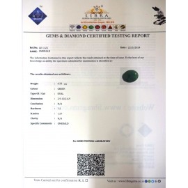 REPORT.NO.- LE 178CLARITY.- N/ACOLOUR.- GREENSHAPE/CUT.- OVALWT.- 3.01 CTSDIMENSION.- 2-1.8-5.4-1.R.INDEX.- 1.57HARDNESS.- 7.5COMMENT.- EMERALD..