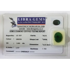 REPORT.NO.-LE 337CLARITY.-N/ACOLOUR.-GREENSHAPE/CUT.-OVALWT.-3.82 CTSDIMENSION.-3.5-10.4-3.7R.INDEX.-1.57HARDNESS.-7.5COMMENT.-EMERALD..