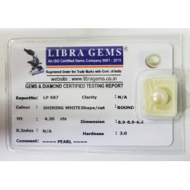 REPORT NO . LP 987CLARITY . N/ACOLOUR . SHINING WHITESHAPE / CUT . ROUNDWT . 4.30 CTSDIMENSION . 8-9.8-9.6-4.R . INDEX . N/AHARDNESS . 3.0COMMENT . PEARL..