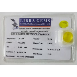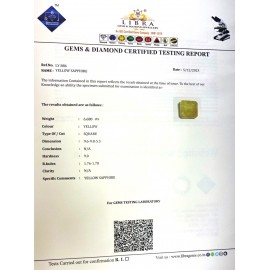 REPORT NO . LY 108CLARITY . N/ACOLOUR . YELLOWWT . 6.87 CTSDIMENSION . 1-6.10-5.5-3.R . INDEX . 1.76-1.78HARDNESS . 9.0COMMENT . YELLOW SAPPHIRE..