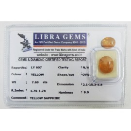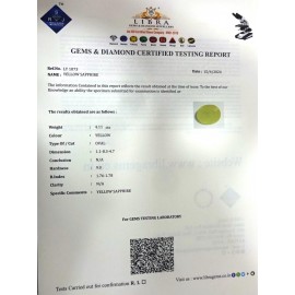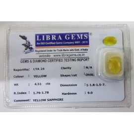 REPORT NO . LYA 24CLARITY . N/ACOLOUR . YELLOWSHAPE / CUT . OVALWT . 4.51 CTSDIMENSION . 1-1.8-1.5-7.R . INDEX . 1.76-1.78HARDNESS . 9.0COMMENT . YELLOW SAPPHIRE..