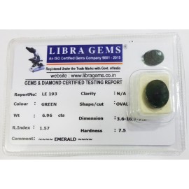 REPORT.NO.-LE 693CLARITY.-N/ACOLOUR.-GREENSHAPE/CUT.-OVALWT.-5.49 CTSDIMENSION.-4-2.10-6.4-4.R.INDEX.-1.57HARDNESS.-7.5COMMENT.-EMERALD..