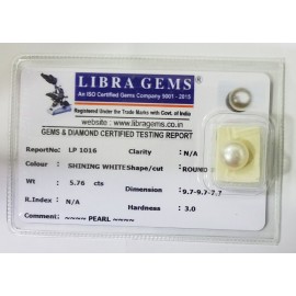 REPORT NO . LP 1016CLARITY . N/ACOLOUR . SHINING WHITESHAPE / CUT . ROUNDWT . 5.76 CTSDIMENSION . 9-7.9-7.7-7.R . INDEX . N/AHARDNESS . 3.0COMMENT . PEARL..