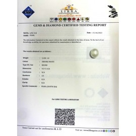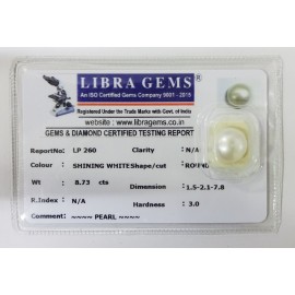 REPORT.NO.-LPS 273CLARITY.-N/ACOLOUR.-SHINING WHITESHAPE/CUT.-ROUNDWT.-3.39 CTSDIMENSION.-7-8.7-9.8-1.R.INDEX.-N/AHARDNESS.-3.0COMMENT.-C / WATER PEARL { SOSI }..