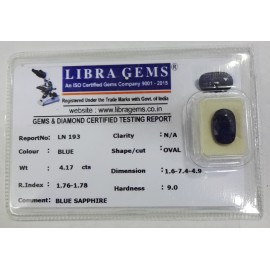REPORT NO . LN 193CLARITY . N/ACOLOUR . BLUESHAPE / CUT . OVALWT . 4.17 CTSDIMENSION . 1-6.7-4.4-9.R . INDEX . 1.76-1.78HARDNESS . 9.0COMMENT . BLUE SAPPHIRE..