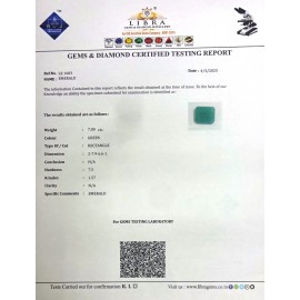 DATE:4-3-2025REF.NO:LE 1683NAME:EMERALDWEIGHT:7.00 CTSCOLOUR:GREENTYPE OF/CUT:RECTANGLEDIMENSION:2-7.9-6.6-1.CONCLUSION:N/AHARDNESS:7.5R.INDEX:1.57CLARITY:N/ASPECIFIC COMMENTS:EMERALD..