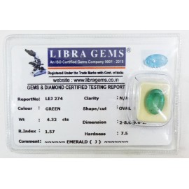 REPORT.NO.LEJ 274CLARITY.N/ACOLOUR.GREENSHAPE/CUT.OVALWT.4.32 CTSDIMENSION.2.8-8.9-6.1R.INDEX.1.57HARDNESS.7.5COMMENT.EMERALD {J}..