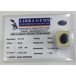 REPORT NO . LN 161CLARITY . N/ACOLOUR . BLUESHAPE / CUT . OVALWT . 5.95 CTSDIMENSION . 1-5.8-1.6-7.R . INDEX . 1.76-1.78HARDNESS . 9.0COMMENT . BLUE SAPPHIRE..