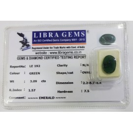 REPORT.NO.-LE 192CLARITY.-N/ACOLOUR.-GREENSHAPE/CUT.-OVALWT.-3.09 CTSDIMENSION.-2.2-8.7-4.4R.INDEX.-1.57HARDNESS.-7.5COMMENT.-EMERALD..