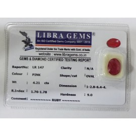 REPORT NO . LR 147CLARITY . N/ACOLOUR . PINKSHAPE / CUT . OVALWT . 4.21 CTSDIMENSION . 1-2.8-6.4-4.R . INDEX . 1.76-1.78HARDNESS . 9.0COMMENT . RUBY..