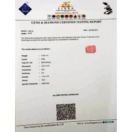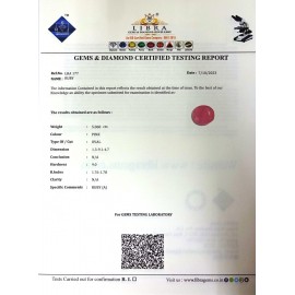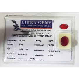 REPORT NO . LR 264CLARITY . N/ACOLOUR . PINKSHAPE / CUT . OVALWT . 4.36 CTSDIMENSION . 1-5.9-1.4-3.R . INDEX . 1.76-1.78HARDNESS . 9.0COMMENT . RUBY..