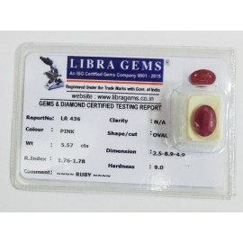 REPORT.NO.-LR 436CLARITY.-N/ACOLOUR.-PINKSHAPE/CUT.-OVALWT.-5.57 CTSDIMENSION.-2-5.8-9.4-9.R.INDEX.-1.76-1.78HARDNESS.-9.0COMMENT.-RUBY..