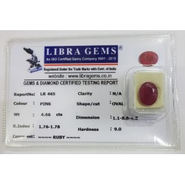 REPORT.NO.LR 465CLARITY.N/ACOLOUR.PINKSHAPE/CUT.OVALWT.4.66 CTSDIMENSION.1.1-8.8-4.8R.INDEX.1.76-1.78HARDNESS.9.0COMMENT.RUBY..